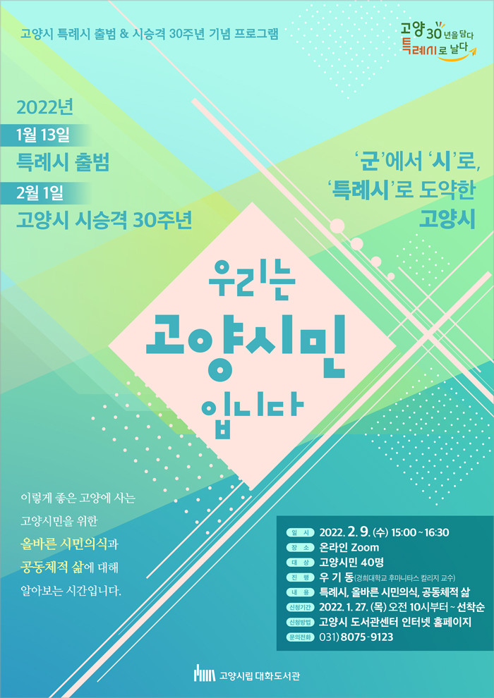 [부자동네타임즈 김인수기자] 고양시 대화도서관이 특례시 출범과 시 승격 30주년을 맞아 문화 프로그램 우리는 고양시민입니다를 오는 2월 9일 온라인으로 운영한다.