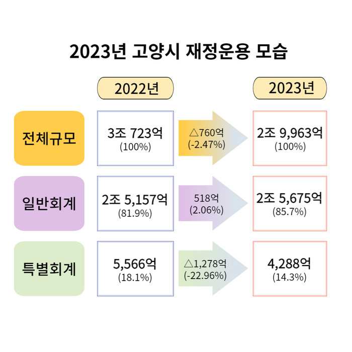 [부자동네타임즈 김인수기자] 고양특례시(시장 이동환)는 지난 21일 2조 9,963억 원 규모의 2023년도 예산안을 편성해 시의회에 제출했다. 전년 대비 일반회계는 518억 원 늘어난 반면, 특별회계는 1,278억 원이 줄어 전체 규모로는 760억 원 가량 감소했다.