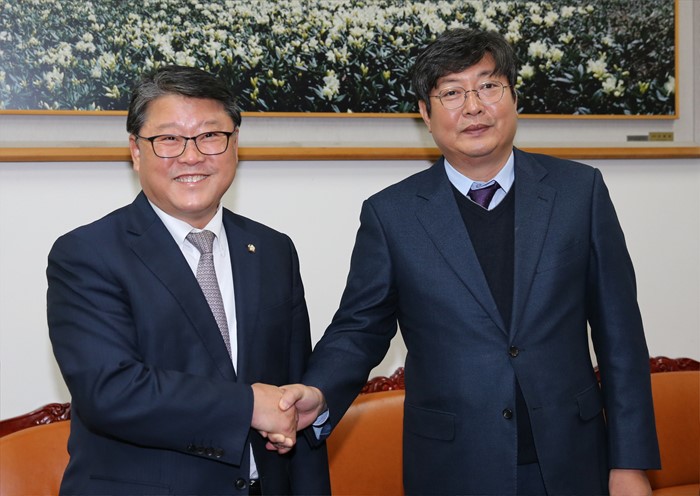 △ 조원진(왼쪽), 이춘석 여야 원내수석부대표가 16일 오후 서울 여의도 국회에서 쟁점 현안 관련 논의를 위해 만나 악수하고 있다. <사진제공=포커스뉴스>
