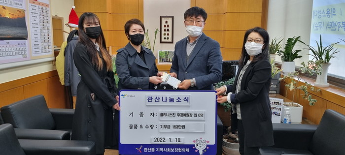 지난 1월 10일, 관산동 행정복지센터(동장 서병하)는 관산동 소재 클리니스킨(피부, 체형관리 클리닉 업체)의 원장과 고객 6명이 지역사회 힘든 이웃들을 위해 총 153만원의 성금을 관산동에 기부했다고 밝혔다.