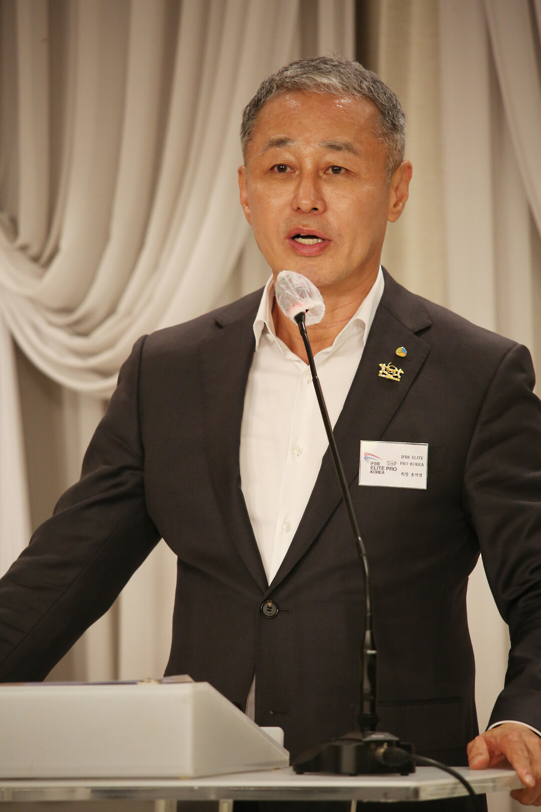 [사진설명] IFBB ELITE PRO KOREA 회장 송석영 발대식에서 당당히 포부를 전하고 있다.