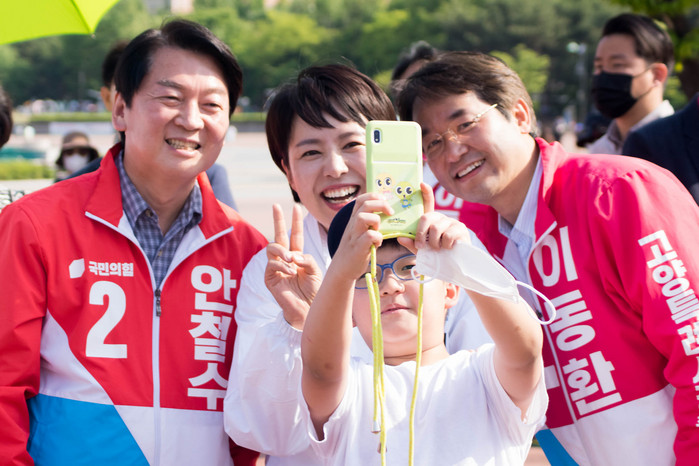 [사진설명] 국민의힘 이동환 고양시장 후보가 안철수 성남분당갑 국회의원 후보, 김은혜 경기도지사 후보와 함께 지난 28일 일산 호수공원에서 만난 어린이와 셀카 촬영을 하고 있다.