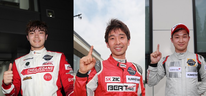 [사진설명] 2019 한중일 슈퍼챌린지에 참가하는 슈퍼 6000 클래스 4라운드 우승자 김동은, GT1 클래스 시즌 챔피언 정경훈, GT2 클래스 시즌 챔피언 박희찬(왼쪽부터)
