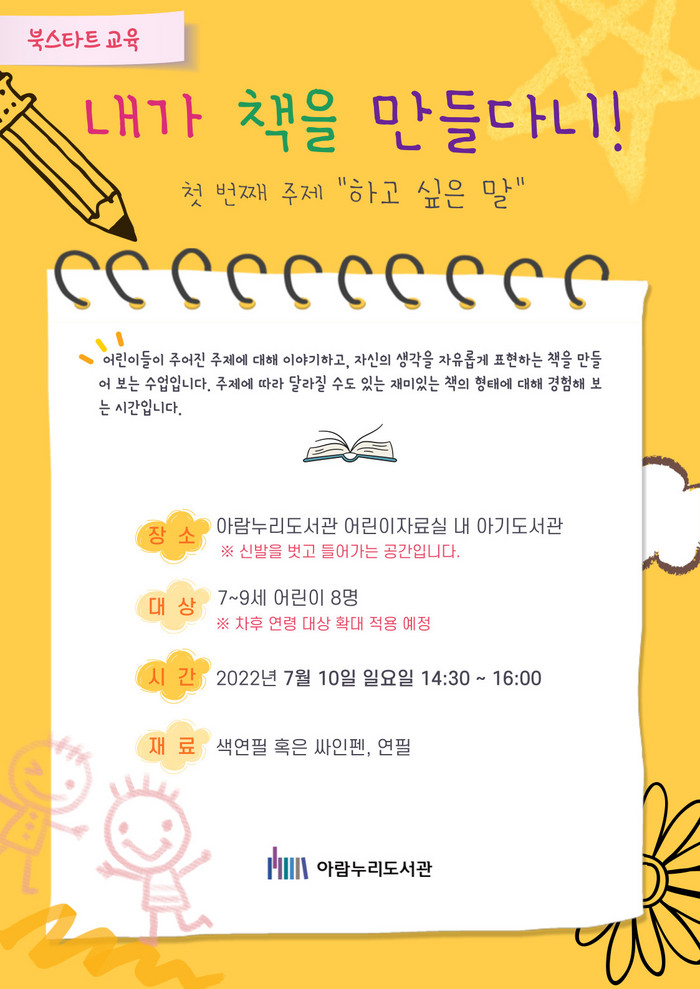 [부자동네타임즈 김인수기자] 고양시 아람누리도서관이 7월 10일 7~9세 어린이를 위한 북스타트 교육 내가 책을 만들다니!를 운영한다.