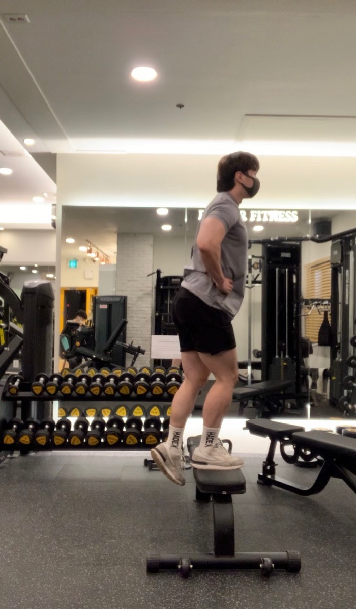의자에 다리를 올려놓는다,올라간 다리에 힘을 주며 중심을 잡아 공중에서 버티며 내려온다, 원위치후 다시 시작.