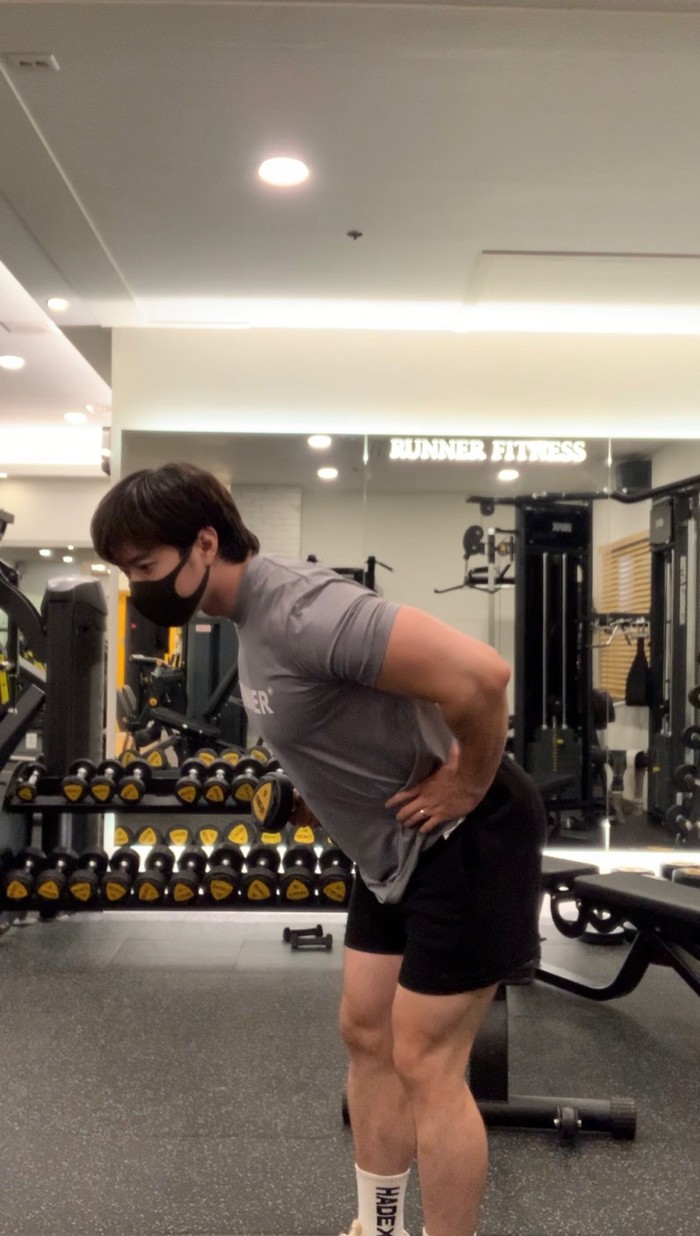 벤트오버 자세로 앞으로 인사하듯 숙여준 다음 한쪽 손에는 덤벨을 들고 있는다.