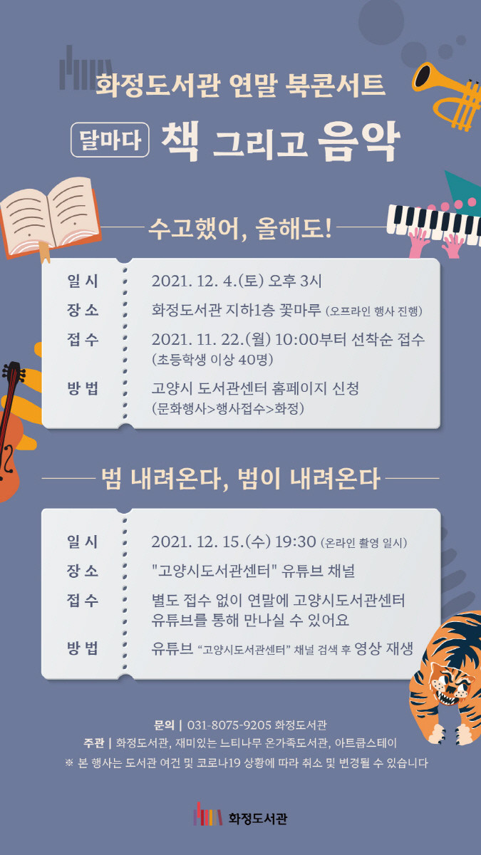 아울러‘범 내려온다, 범이 내려온다’란 주제로 12월 15일(수) 북 콘서트를 온라인 운영한다. 이 콘서트는 ‘고양시 도서관센터’유튜브 채널에서 관람할 수 있다.