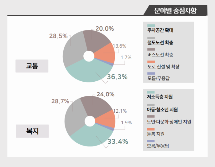 ‘분야별 가장 중점을 두어야 할 사안’으로 교통 분야에서는 특히 주차공간 확대(36.3%)와 철도노선 확충(28.5%)에 대한 요구가 높은 것으로 나타났다.
