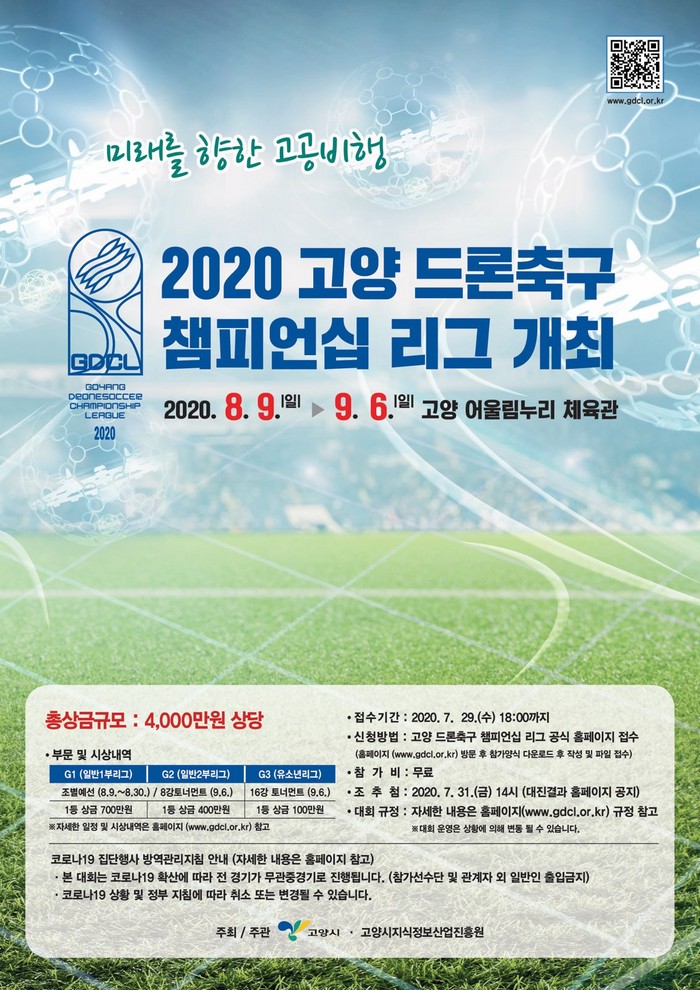 [부자동네타임즈 김인수기자] 국내 드론 산업의 핵심 도시로 부상하고 있는 고양시(시장 이재준)에서 오는 8월부터 9월까지 국내 최초, 전국 규모의 ‘고양 드론 축구 챔피언십 리그(Goyang Dronesoccer Championship League, GDCL)’가 개최된다.