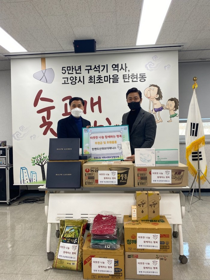 탄현 두산위브더제니스 생활지원센터장은 “아파트 주민들이 모아주신 후원금과 물품을 어려운 이웃을 돕기 위해 기부해 기쁘다”며, “우리 이웃들에게 작은 도움이 되길 바란다”고 전했다.