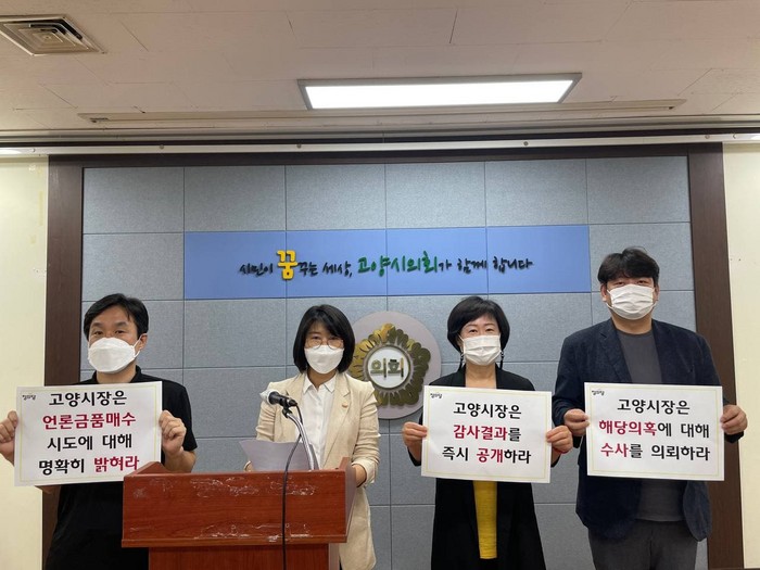 “킨텍스 지원부지 헐값 매각 의혹이 제기된 2019년 2월 이후 2년이 넘도록 감사가 진행되었으나 결과는 나오지 않고 오히려 시행사와 연계된 고양시 기관사람들이나 기자에게 금품제안을 했다는 기사들이 보도되었다”며 그런데도 “해명은커녕 입장표명도 없는 시장의 태도가 이해하기 어렵다”고 말했다.