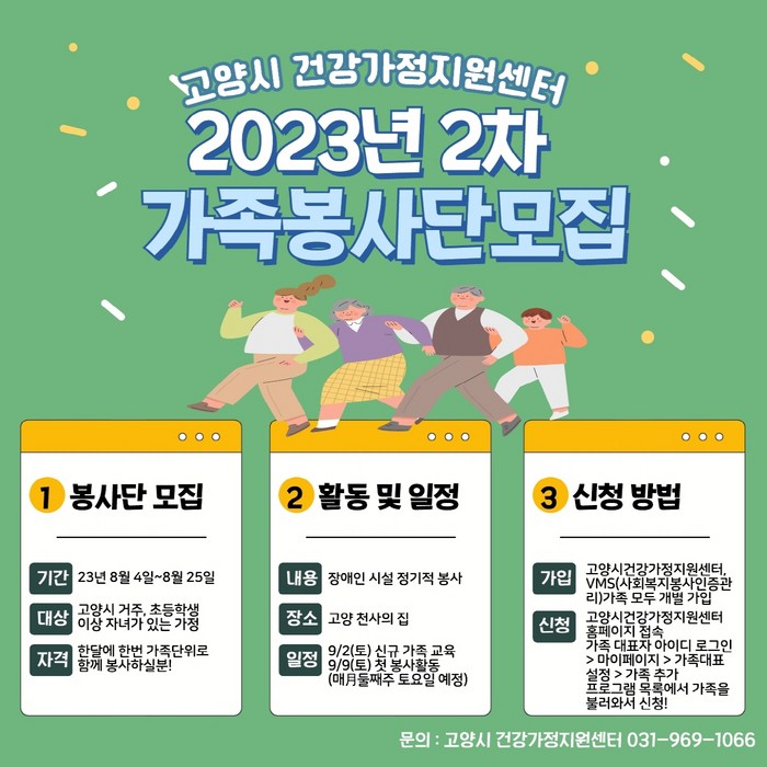 [부자동네타임즈 김인수기자] 건강가정지원센터에서 오는 8월 25일까지 2023년 하반기 ‘가족봉사단’의 참여자를 모집한다.