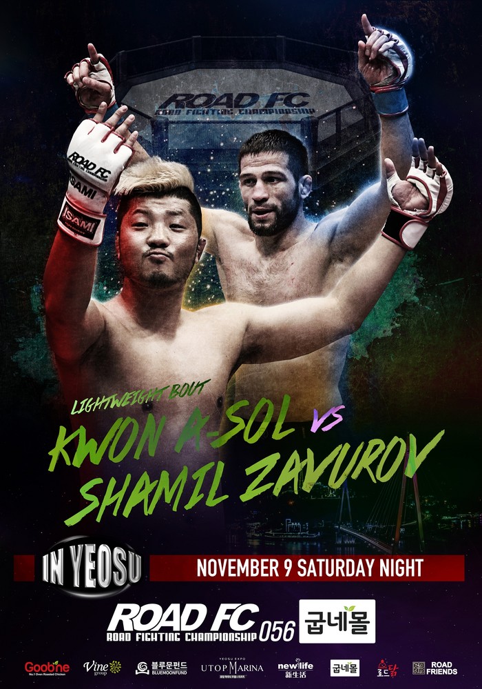 [부자동네타임즈 김인수기자] ROAD FC (로드FC)는 11월 9일 여수 진남체육관에서 굽네몰 ROAD FC 056을 개최한다. 메인 이벤트로 권아솔이 샤밀 자브로프와 대결하는 가운데, ‘밴텀급 챔피언’ 김민우도 장익환과 타이틀전을 치러 1차 방어 성공에 도전한다.