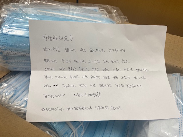이 남성은 손 글씨로 눌러쓴 응원편지와 함께 마스크 등이 담긴 5개의 박스를 남기고는 신원을 묻는 직원에게 이름도 남기지 않고 홀연히 사라졌다.