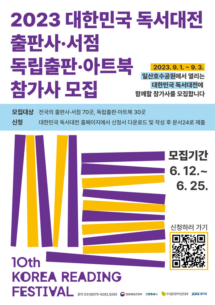 [부자동네타임즈 김인수기자] 9월 1일부터 3일까지 일산호수공원 일원에서 열리는 국내 최대 독서문화축제인 ‘2023 대한민국 독서대전’ 북마켓에 함께할 출판사, 서점 100개소를 모집한다.