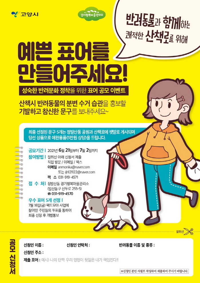 공모 참여는 신청인 이름, 연락처, 반려동물 이름 및 종류, 신청인 주소, 제출 표어를 작성해 직접방문(정발산동 경기행복마을관리소)로 제출하면 된다.
