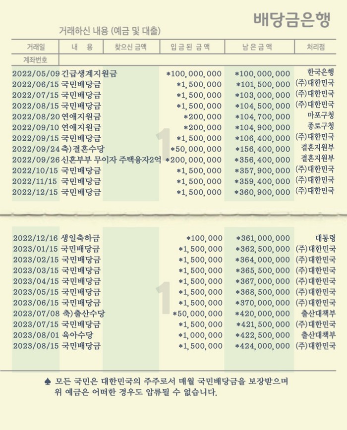 1. 대한민국은 주식회사이고 국민은 (주)대한민국의 주주이다. 2. (주) 대한민국의 총재산은 7경 정도이며 주주는 5천만 명이다3. 5천만 명의 주주들이 한 사람당 약 14억씩 나라에 맡겨놓은 셈이다.4. 14억을 연 1.3% 이자로 환산하면 1,820만원 즉, 월 150만원 이상을 배당금으로 받아야 한다.(참고) 국민배당금은 형편이 어려워서 받는 선심성 복지예산이 아니다, (주) 대한민국의 주주로서 배당을 받는 당연한 재산권 행사다.[사실정리](1) 국민배당금150만원? 국민이 당연히 배당 받아야 할 돈이다.(2) 나라에 돈이 없는 게 아니라 도둑이 많다. 국가예산을 대폭 절약해, 이제는 국민에게 직접 혜택이 가도록 해야 한다.