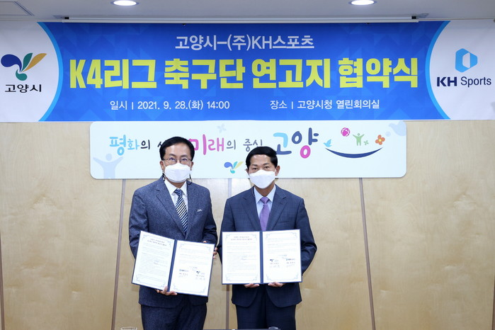 [부자동네타임즈 김인수기자] 고양시가 지난 28일 고양시청 열린회의실에서 ㈜KH스포츠 (구단명: 고양KH축구단)와 2022년 K4리그 참가를 위한 연고지 협약을 체결했다.