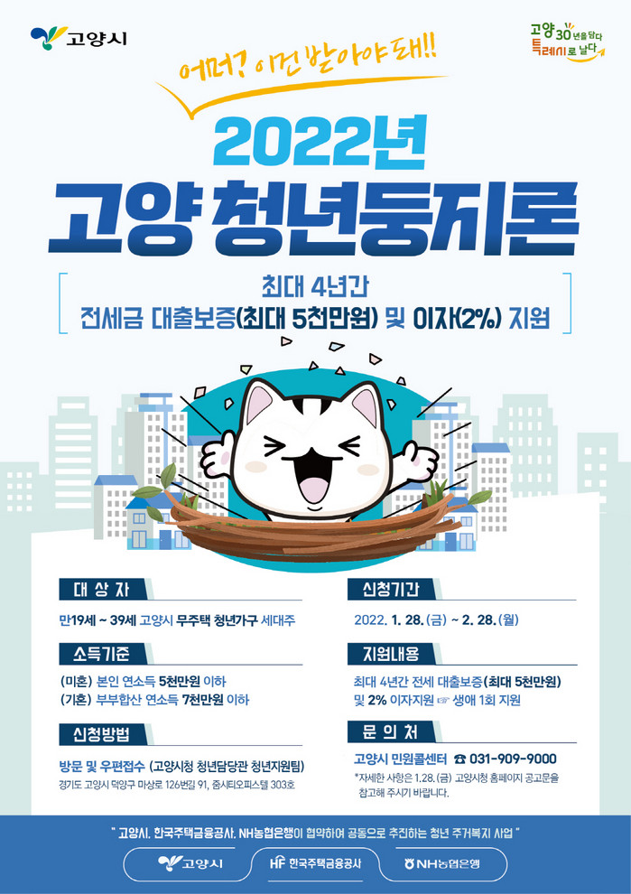 ‘고양 청년둥지론’은 한국주택금융공사와 NH농협은행과 협약해 무주택 청년가구(연 200가구)를 대상으로 최대 4년간 최대 5천만 원의 전세보증금 대출추천 및 대출이자 2%(최대 100만원)를 지원해 주는 사업이다.