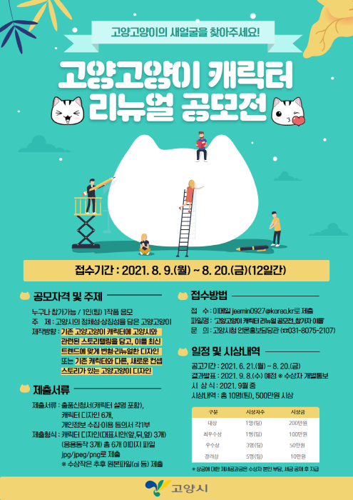시 관계자는 “지난 9년 간 고양고양이 캐릭터가 많은 사랑을 받아왔는데, 단 한번도 리뉴얼 한 적이 없었다”며“이번 공모전을 통해 고양시의 이미지가 잘 녹아들어 있는 참신한 고양고양이 캐릭터를 만날 수 있기를 기대한다 ”고 말했다.