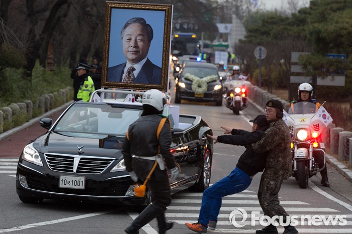 (서울=포커스뉴스) 26일 오후 서울 동작구 국립현충원으로 들어서고 있는 故 김영삼 전 대통령 운구 행렬을 한 시민이 막고 있다.