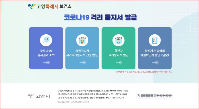 시스템 개선에 따라 코로나19 PCR 검사 결과나 격리통지서나 격리해제 사실확인서가 필요한 시민은 고양시 홈페이지→고양 코로나19 현황→코로나19 격리통지서 발급을 통해 고양시 코로나19 격리통지서 발급 시스템을 이용할 수 있다.