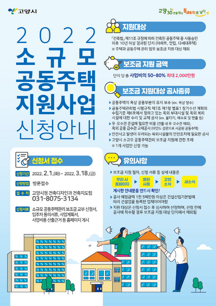 [부자동네타임즈 김인수기자] 고양시가 ‘2022년 소규모 공동주택 관리업무 보조금 지원 사업’의 신청 접수를 3월 18일까지 받는다고 밝혔다.