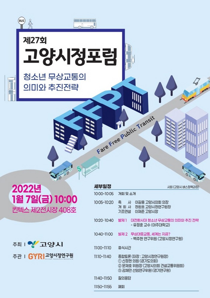 포럼은 이길용 고양시의회의장의 축사와 이재준 고양시장의 기조연설을 시작으로 아주대학교 유정훈 교수의 ‘무상교통의 역할, 도시문제의 대안으로의 무상교통 방향’ 고양시정연구원 백주현 연구위원의 ‘무상교통에 적용 가능한 해외사례 발표’ 순서로 발제가 있을 예정이다.