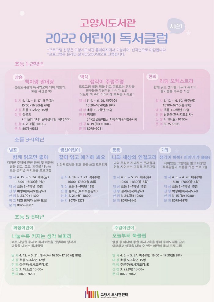 [부자동네타임즈 김인수기자] 고양시 시립 도서관이 오는 4월부터 ‘2022 어린이 독서클럽 시즌1’을 운영한다. 올해 어린이 독서클럽 시즌1은 고양시의 9개 시립도서관과 함께 학년별로 다양한 주제의 독서클럽을 진행한다.