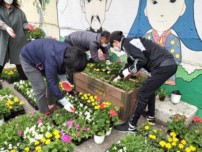 행사에 참여한 주민자치위원들은 아파트 단지와 농촌지역 22곳에 사피니아, 제라늄, 메리골드, 베고니아 등 형형색색의 꽃 2,456본을 식재하고 주민들의 쉼터이자 힐링 장소인 공릉천 하천가 일대에도 백일홍, 천일홍, 해바라기, 유채 등 4종의 꽃씨를 심었다.