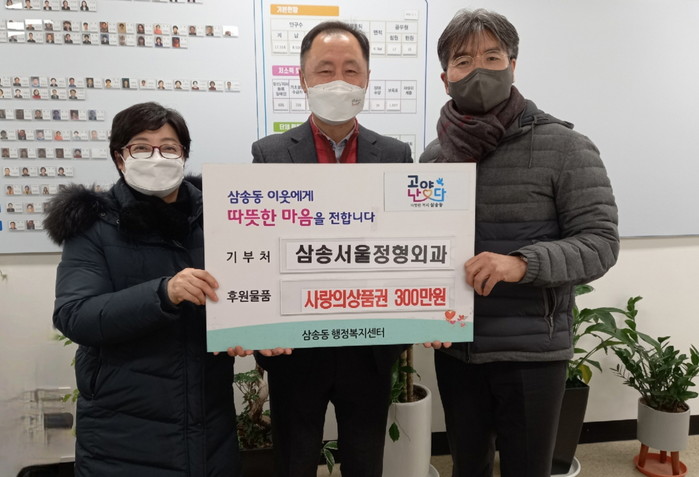 지하철 3호선 삼송역 인근에 위치한 삼송서울정형외과는 2019년 병원 개원 이래 매년 2회씩 동 행정복지센터를 통해 상품권 및 식품 꾸러미 등 따뜻한 나눔을 실천해 지역사회로부터 박수갈채를 받고 있다.