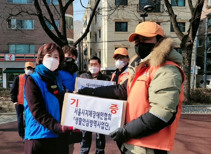 이날 “찾·방”은 서울시지체장인협회 생활안심방역사업단에서 서초오렌지봉사단에 전문 방역에 필요한 방역물품을 기증하고, 서초구 방배동에 위치한 시각장애인복지시설을 시작으로 하여 놀이터, 방배동 카페골목, 사우나 시설 등을 방문해 전문적인 방역봉사활동을 펼쳤다.