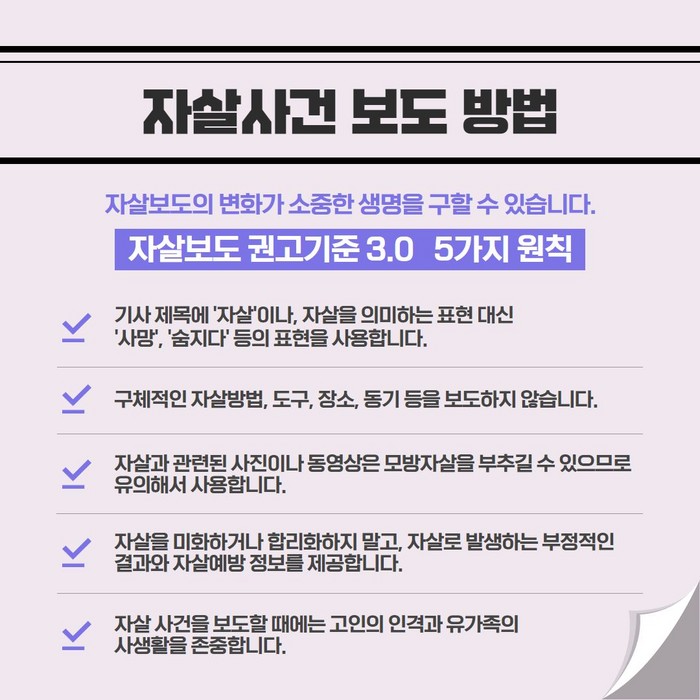 [부자동네타임즈 김인수기자] 고양시 일산동구보건소 고양시자살예방센터는 3~5월 자살 고위험군 집중관리 기간을 맞이하여 온라인 및 관내 언론사에 ‘자살 보도 권고 기준 3.0’을 배포했다.