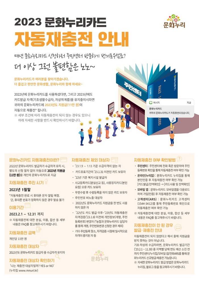 자동재충전은 2022년 문화누리카드 발급자가 수급자격을 유지할 시, 2023년 지원금 11만원이 별도의 신청 절차 없이 자동으로 개인의 문화누리카드로 지급된다. 충전된 카드는 올해 2월 1일부터 12월 31일까지 사용이 가능하다.