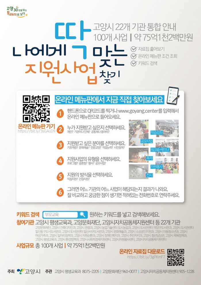 [부자동네타임즈 김인수기자] 고양시가 시민들이 쉽게 지원사업 정보를 파악하고 이용할 수 있도록 고양시의 교육 기반 22개 기관에서 추진하는 사업을 핵심 정리한 ‘나에게 딱 맞는 지원사업 찾기’온라인 자료집을 발간했다.