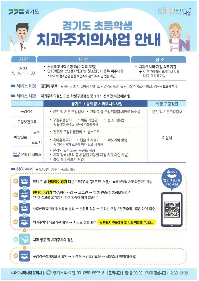 대상 학생은 ‘덴티아이경기’ 앱을 내려받아 온라인 교육을 이수하고 문진표를 작성한 뒤 고양시 홈페이지 게재 또는 학교에서 배부한 학부모 안내문에서 확인한 지정 의료기관(치과)에 사전 전화 예약 후 방문하면 된다.