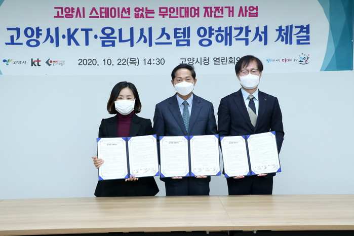 고양시와 KT, 옴니시스템은 22일 양해각서를 체결하고, 안정적이고 편리한 무인대여 공유자전거 서비스 도입을 위해 협업하게 된다. 시가 인프라와 행정적 지원을 담당하고 KT는 자전거 운영 플랫폼과 무선통신, 잠금장치 등의 개발을 맡고 옴니시스템은 자전거 공급과 사용자 앱 등 서비스를 총괄한다.