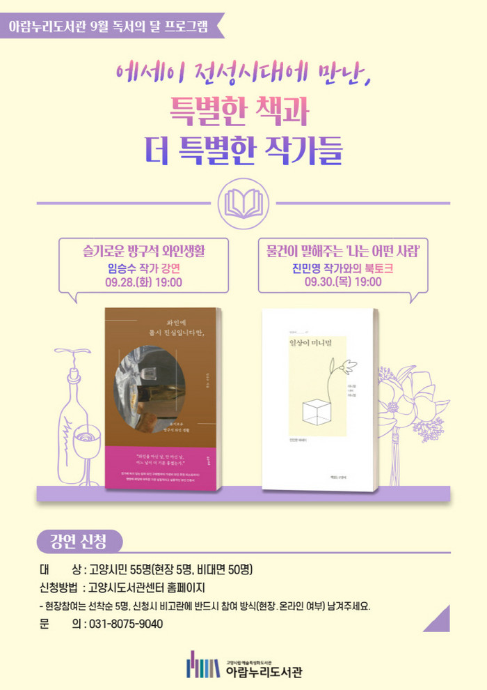 [부자동네타임즈 김인수기자] 고양시 아람누리도서관이 9월 독서의 달을 기념해 두 명의 에세이 작가를 초청, 강연 및 북토크‘에세이 전성시대, 특별한 책과 더 특별한 작가들’를 진행한다.