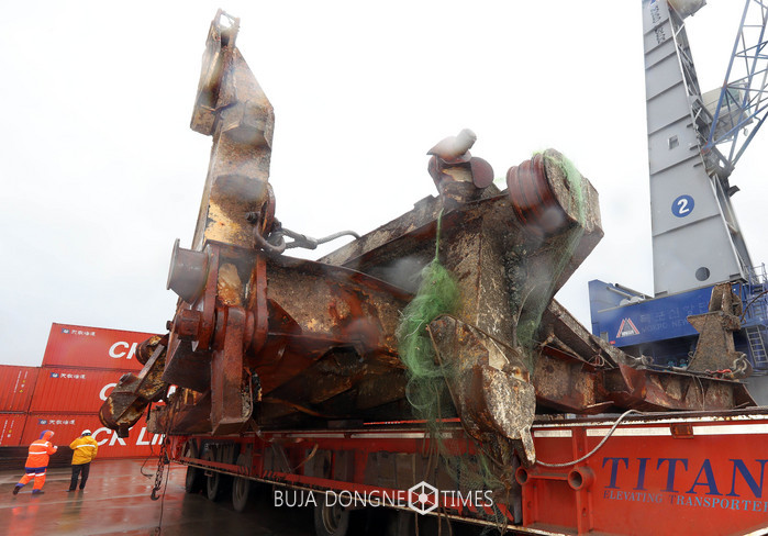 세월호 선체를 육상에 거치하는 작업이 초읽기에 들어간 5일 오전 전남 목포신항만에 사고해역에서 수거된 세월호 선미램프가 이송되고 있다. 2017.04.05.