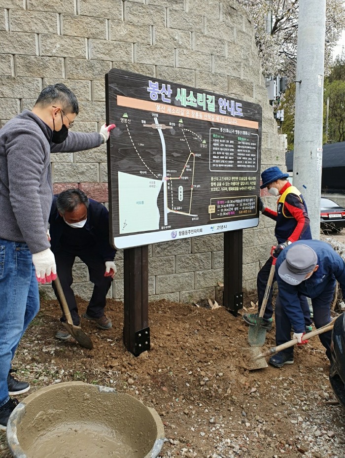 이날 행사에서는 서오릉 건너편에 위치한 봉산(208m, 고양시 덕양구) 산책길 중 용두동 지역의 코스 개발을 알리는 ‘봉산 새소리길’안내판을 설치하고, 서오릉상친회(회장 원종호)와 함께 봉산 새소리길 여러 곳에 나무로 제작한 새집을 매달아 길을 단장했다.