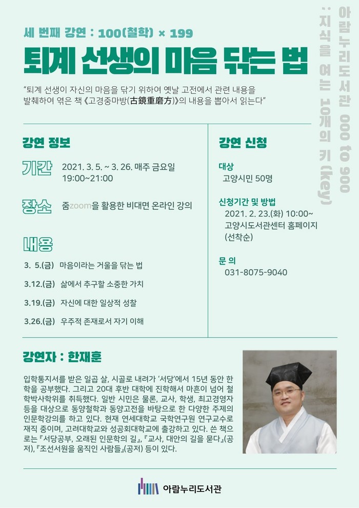 이번 ‘퇴계 선생의 마음 닦는 법’ 강연은 줌(Zoom)을 통한 비대면 온라인 방식으로 운영되며, 수강 신청은 오는 2월 23일(화) 오전 10시부터 고양시도서관센터 홈페이지를 통해 할 수 있다.