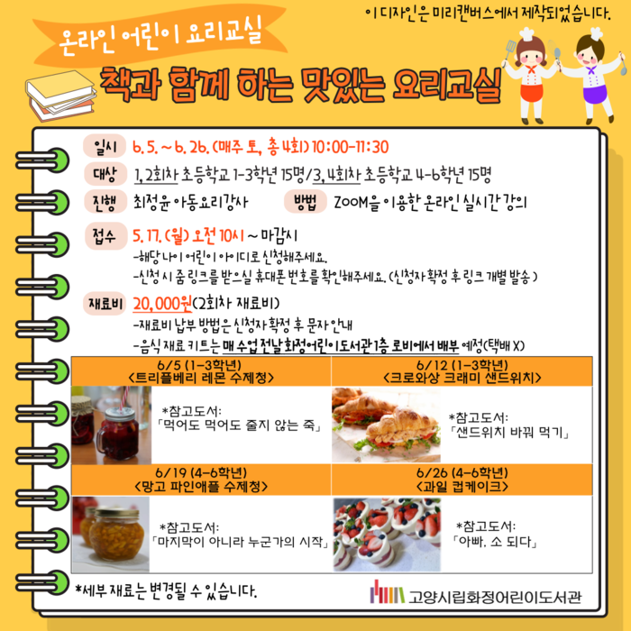 [부자동네타임즈 김인수기자] 고양시 화정어린이도서관에서는 6월 5일부터 어린이 요리교실 프로그램 ‘책과 함께 하는 맛있는 요리교실’을 온라인으로 운영한다.