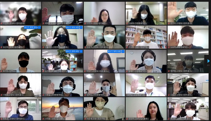 [부자동네타임즈 김인수기자] 고양시가 고양도시관리공사를 비롯한 산하 7개 공공기관에 2021년 통합채용으로 입사한 신규 직원 58명을 대상으로 지난 8월 31일 시 최초 실시간 화상 통합 워크숍을 진행했다.