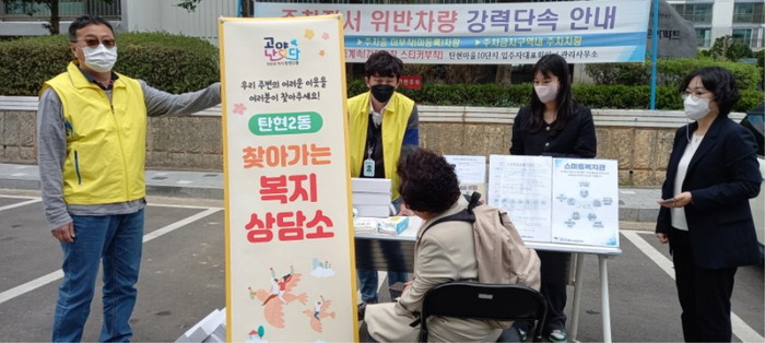 [부자동네타임즈 김인수기자] 고양시 일산서구 탄현2동 행정복지센터(동장 이종신)는 지난 13일 관내 탄현10동문아파트 단지 내 주차장에서 고양시대화노인종합복지관과 함께하는 찾아가는 복지상담소 및 복지사각지대발굴 캠페인을 운영해 주민들에게 한 걸음 더 가까이 다가가는 복지행정을 펼쳤다.
