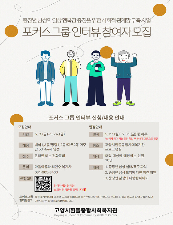 포커스그룹 인터뷰 참여조건은 고양시 2권역(백석1,2동/장항1,2동/마두2동)에 거주하는 만 50세~64세 남성이며, 5월 24일까지 모집한다.