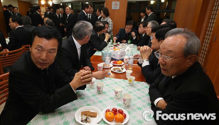 | △ 새누리당 김무성 대표가 23일 서울 종로구 서울대병원 장례식장에 마련된 고 김영삼 전 대통령의 빈소에서 조문객들을 맞이하고 있다. 사진공동취재단 photo@focus.kr |
