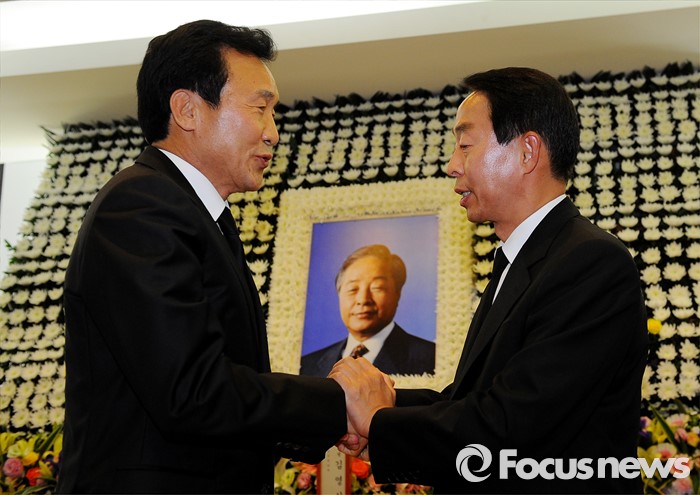 △ 고(故) 김영삼 전 대통령의 빈소를 찾은 김무성(왼쪽) 새누리당 대표와 손학규(오른쪽) 전 새정치민주연합 상임고문. <사진제공=포 커스뉴스> |