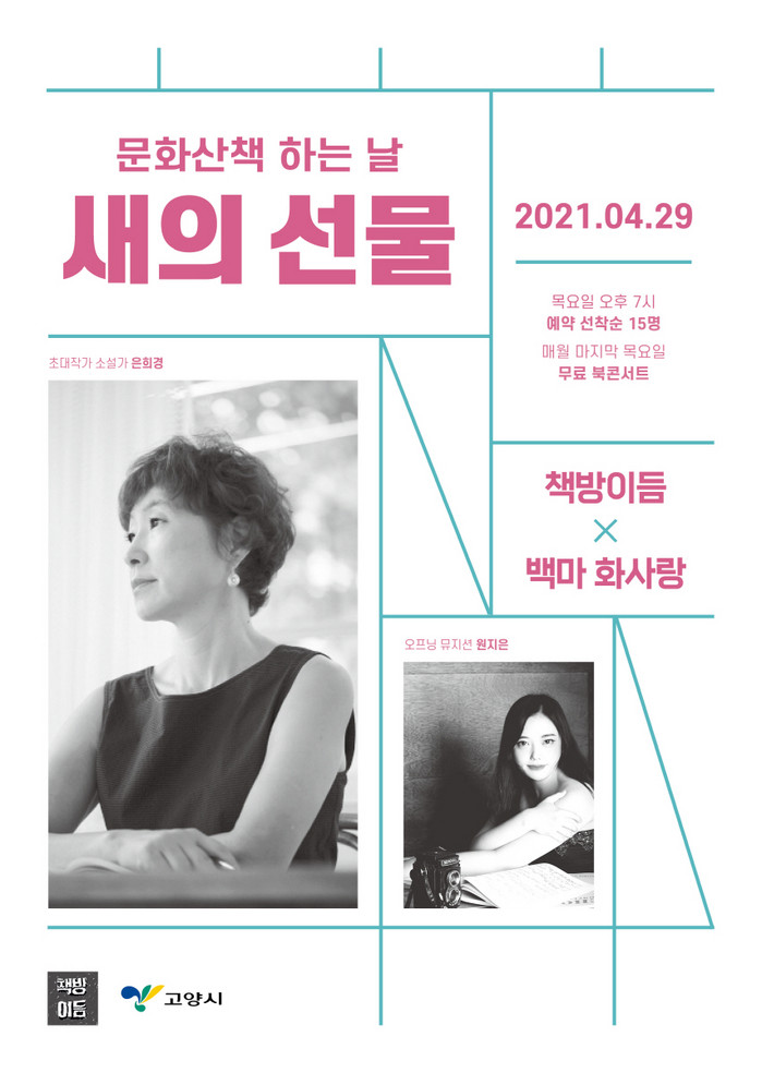 첫 회는 오는 29일 19시 백마 화사랑에서 열릴 예정이다. 초대 작가는 고양시에 오래 거주한 은희경 소설가로 첫 소설책‘새의 선물’100쇄 기념을 겸한 북 콘서트로 꾸며진다.