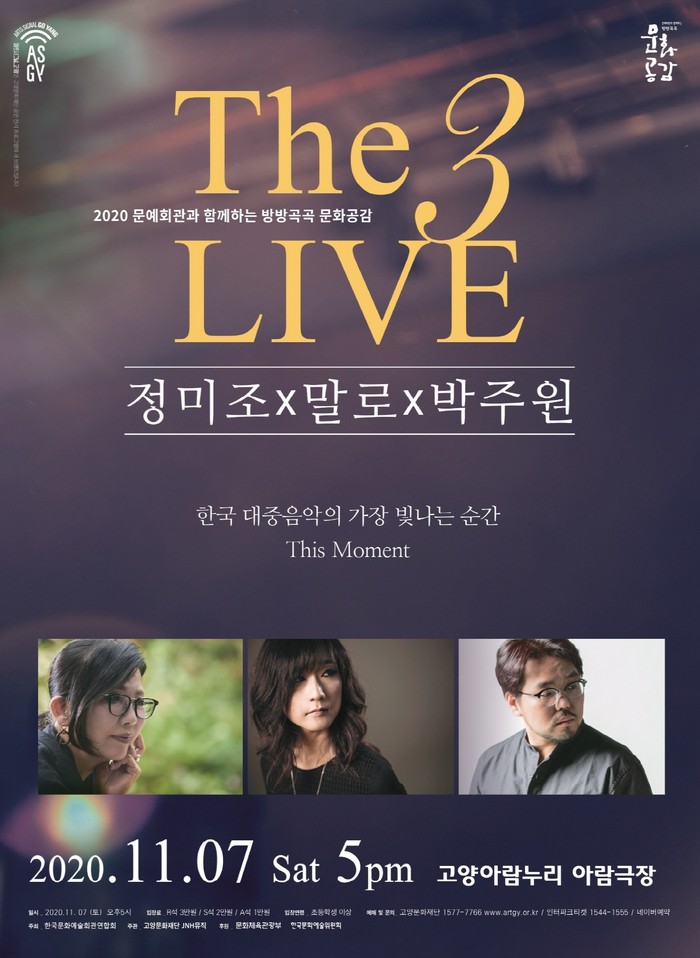 [부자동네타임즈 김인수기자] 고양문화재단(대표이사 정재왈)은 11월 7일 토요일, 고양아람누리 아람극장에서 정상급 아티스트가 출연하는 콘서트 <정미조x말로x박주원 ‘The 3 LIVE’>를 개최한다. 가요계의 전설 정미조, 스캣의 여왕 재즈보컬 말로, 집시 기타리스트 박주원이 출연하는 본 공연은 깊어가는 가을에 걸맞은 프로그램과 뛰어난 호흡을 자랑하는 아티스트의 콜라보로, 한국 대중음악의 품격을 전해줄 것이다.