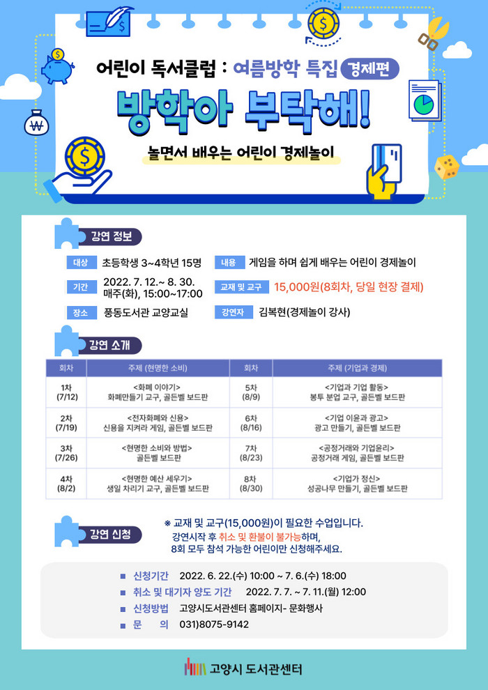 [부자동네타임즈 김인수기자] 고양시 풍동도서관이 오는 7월 12일(화)부터 8월 30일(화)까지 초등학생 3~4학년을 대상으로 어린이 독서클럽을 진행한다. 이번 독서클럽은 경제를 주제로 진행된다.